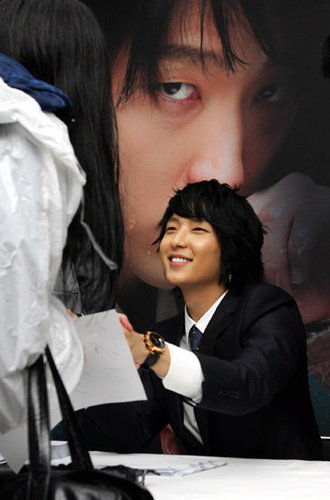 這天一直在下雨,3、4點鐘雨才停,原定5點開始的簽名會外早早就聚集了眾多穿雨衣的粉絲,據說還有頭天晚上就來排隊的呢,天哪,這麼冷的天。李準基提前十幾分鐘就出現在了簽名會簡易帳篷中,這在習慣遲到的韓國藝人中算是很少見的了。