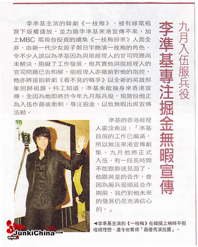 李準基的香港經理人霍汶希說:“李準基目前的工作已編滿, 所以無法來港宣傳劇集,九月他將正式入伍,有一段長時間不能跟影迷見面了,他跟英皇的合作,會因為服兵役順延合作期限,我們對他未來的發展仍是充滿信心的。”