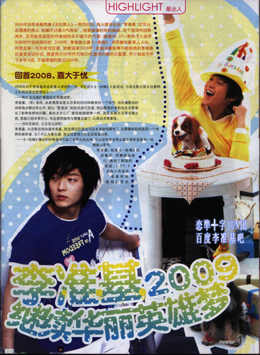 2006年當李準基憑藉王的男人>>一炮而紅時,有人曾評論說李準基比女人還漂亮的男人,熱潮不過是人氣泡沫,但是隨著時間的推移,這個泡沫並沒有消失,反而愈發成型化作美麗的永不破滅的氣球,隨著06、07一系列令人拍手叫好的作品相繼問世,2008年,李準基出演一枝梅,將英雄形象深入人心,並掀起新一輪的收視狂潮,轉眼迎來2009年,在娛樂圈取得不俗成績的李準基在接受采訪時說,期望將2009年作為他20代演員時期的總整理,並計劃在今年下半年入伍,不留遺憾的度過2009年。 回首2008,喜大於優 2008年對於李準基來說是意義深刻的一年,不僅因為一枝梅大獲成功,與音樂教父徐太志意料之外的見面也是理由之一。 ----和太志見面的事現在還很激動吧? 李準基:〔笑〕是呀,本來那原本是太志哥的回歸特輯裡的一個環節,當時攝影的時間和地點都沒有公開,就以歌迷會的形式進行見面,我以歌迷的身份向太志哥提出了各種各樣的問題,真的太開心了,感覺就像做夢一樣,其實在跟太志哥見面之前,我就已經非常開心,而且想到就將與偶像見面了,心裡還非常緊張。 ----當時見面后,太志怎麼說呢? 李準基:太志哥說他知道李準基,我覺得僅僅是這句話本身就很稀奇了,在偶像面前我就是一個純粹的祟拜者,為了一讓大家失望,我必須更努力去實現演員夢。 ----一枝梅播出的時候曾經引起了非常大的反應,可以說有很多觀眾甚至將李準基和一枝梅畫上等號。 李準基:結束一枝梅的拍攝後,到賽班島旅行,遇到了韓國的家庭,幾個5、6歲的小男孩說’準基哥哥’給我們簽名吧!我以為是簽自己的名字,沒想他們說’請再簽一枝梅的名字’(笑)。通過這件事,讓我感受到了李準基等於一枝梅,也回想起了喜歡Power ranger的少年時代。 ----聽說中國四川地震的時候,李準基和FAN CLUB的成員齊心協力為災民進行募捐運動,年末又為外國勞動者家庭的子女寄付了一億韓元。 李準基:亞洲飯們早在我之前就以我的名義開始了募捐活動,真的讓我非常感動,我會一直在心中牢記著要以合作活動和交流去回報大家的厚愛,再次謝謝我的FANS們。 最感謝的人是FANS 李準基有多少FANS無法準確的統計,但是只要有李準基出場的任何現場會都會感受到令人驚訝的狂熱指數,在韓國,隨處可以見到李準基的廣告代言,而在中國提到李準基,也有無數人津津樂道。 -----你的CY裡寫滿了9國語言的”我愛你”,包括外國影迷,每天有3000人以上訪問你的CY,這和20歲時懷攜30万韓元,孤零零一個人上京,輾轉居住在閣樓小屋的李準基有著天壞之別。 李準基:上次經過前新村,從車窗裡看到了20歲時住過的啤酒屋,當時,打工做服務生能賺到2500韓元,晚上就縮成一團在啤酒倉庫裡睡覺,之前雖然搬到裡閣樓小屋裡,不過夏天滿屋子的蟑螂跑,冬天水管凍的硬邦邦,經常連臉都不能洗,現在回憶那個時候的我,真是為演戲瘋狂了。 有一段時期,承受過惡性循環和泡沫人氣的壓力,真想該那個所謂的泡沫趕快沈寂,讓大家去關注我的演技,但是,無論如何都無法擺脫人氣束縛的話,那就試試只有人氣時才能挑戰的工作,總之,成為了我最大力量的,始終是FANS。 王的男人之後,付我數億韓元,讓我演男扮女裝和校園故事的提案接踵而來,是FANS的存在,讓我不焦不躁,耐心的等待好劇本。 -----據說最近受到了同齡的TOP STAR Rain的良性刺激。 李準基:看了某個娛樂節目裡Rain的勞苦談和成功記,己經是頂級明星的Rain以新人的姿態在好萊塢拼搏,鞭策自己的樣子給我留下了深刻的印象,如果心中有了瘋狂的渴望,一定要把這種心情表達出來,因為世上無難事,只怕有心人。 ----李準基的座右銘就是,世上無難事只怕有心人? 李準基:是的,嗯,適逢新年,再度確認(笑)。 新劇看不見的戰爭>> 08年底,李準基在眾人的翹首企盼中終於接下了新片,宣布下一部作品是SBS新劇看不見的戰爭。一枝梅中塑造的英雄形象深入人心,李準基也成為正義的化身,觀眾希望再次看到李準基的英雄形象,而在這樣的期待中,李準基的新英雄形象終於又將登場。 ----09年會有哪些主要的活動呢? 李準基:入伍前,為幾年最後的20代時光正在策劃一個和FANS進一步互動的活動,計劃舉辦一個跳舞唱歌,總之能發揮自身特長的各種表演,應該是演唱會形式的Fan Meeting 。上半年就暫定出演SBS的電視劇看不見的戰爭。 ----會有打鬥場面嗎,恐懼在有拍攝打鬥的劇集中負傷嗎? 李準基:據說作品拍攝中受傷是大成功的預兆,拍一枝梅的時候右手背負傷,己經把身上的小傷看作勛章了(笑)。 ----總的說來可以把動作戰當作是享受。 李準基:20代的時候拍動作戲,退伍後的30代挑戰深沈老練的角色,到那個時候,就能揮灑自如的表演愛情戲了吧(笑)。 關於他的友情、愛情和親情 ----據說你喜歡嬌小可愛的女生? 李準基:(笑)嗯,喜歡比較可愛的女生,應該多經歷一下學習型戀愛,單 從這點上說,我的青春荒廢了。(笑) ----在圈內有知己嗎? 李準基:演藝圈的朋友只有南賢俊一人能夠相互理解,其他演員不明白為什麼我在FANS面前又唱又跳,和FANS一起玩,也不理解演員為什麼要做秀。但是,南賢俊理解我的企劃和創意。 -----一直都比較喜歡喝酒吧? 李準基:(笑)嗯,年末年初都有很多人打電話邀我喝酒,可惜受日程約束,不能一一赴約。雖然認為自己酒量無限大,但是年紀大了不饒人,身體重要(笑)。 -----27歲不算老吧,聽說平時也是很注意身體鍛鍊的人。 李準基:(