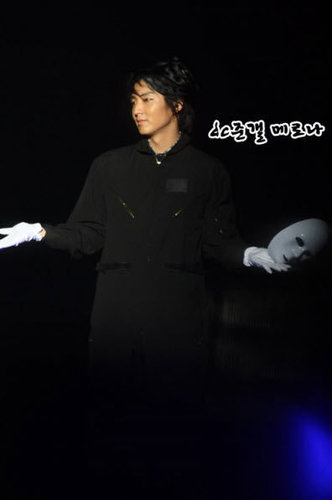 在黑暗的舞臺上,手舉長槍和旗幟的近衛隊登場,個個都戴著口罩。“李準基在哪兒?”粉絲們在焦急地尋找。這時有個人手握雙劍出現在舞臺中心。“是李準基!”記者和粉絲們的照相機鏡頭一致瞄準跳劍舞的人。“他是什麼時候練了這一手?真不賴嘛。”