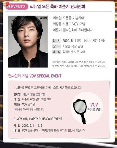 為記念Renewal open,舉辦化妝品品牌VOV代言人李準基影迷簽名會。