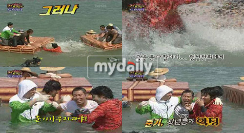 尤其值得一提的是,李準基當天和金秀路、金鐘國和李孝利等最強成員同屬一隊,似乎有“嘉賓特別優待”的意味。與另一隊的劉在錫、大成、李天熙和朴藝真相比,他們在體力上占盡優勢。為了照顧作為嘉賓的李準基,金秀路一直在旁協助他,努力使李準基的形象更為出眾。李準基在第一輪中輕鬆獲勝,但從第二輪開始就不斷出現屈辱的場面,不僅被李天熙一下就推進水里,還被尹忠信當面嘲笑“怎么這么弱啊”。