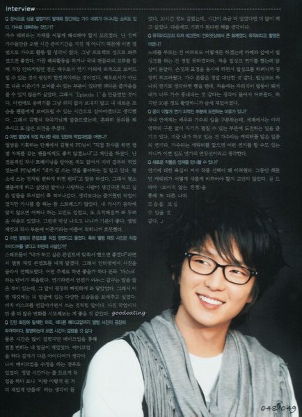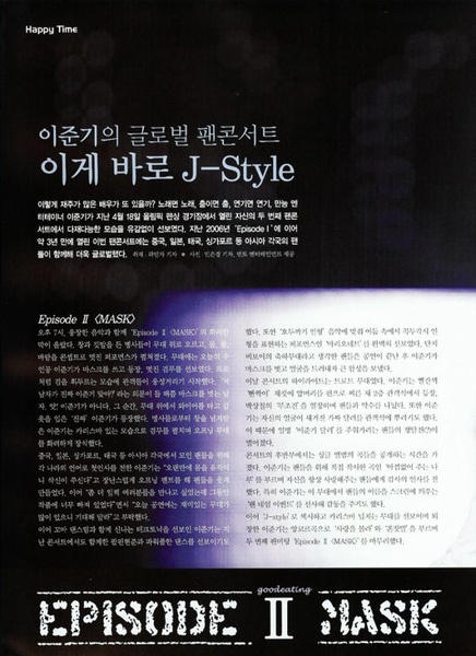 JK: 不明白怎麼樣去解釋不是以歌手初次亮相. 我並不是經過成為歌手一樣長 的準備期. 不想以這次的專輯作為歌手活動. 不要當這樣下去作為項目就好了吧. 偶然在海外活動時及在國內與fans交流時最不能完成的地方就是, 作為演員表演以外, 那是被限制了的地方. 我想, 作為演員能顯示李準基不同特色的其他面貌, 那就可以給予獨特的快樂, 不是嗎? 因此製作了 'Episode Ⅰ'.我想, 不投閒置散而活動著, 是對fans顯示我新的面貌必須要的時候.對金享錫作曲家先生表示了那樣的想法時, 他高興地贊同著, 而我也領受了很多意見.